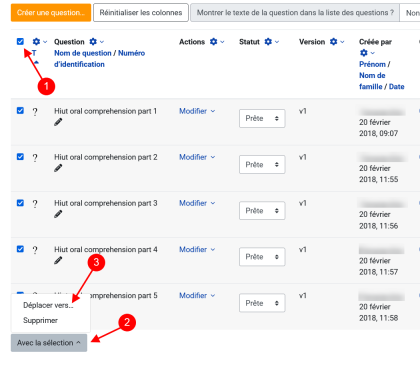 Dans la nouvelle fenêtre qui s'ouvre, choisir la catégorie vers laquelle les questions doivent être déplacées grâce au menu déroulant, puis cliquer sur « Déplacer vers ».